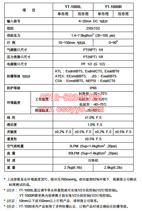 電-氣閥門定位器YT-1000系列產品是從控制系統接收4~20mA直流電流信號來精密調節閥門開度的裝置,本產品內置閥位變送器或限位開關,提高了系統的安全性。  特 點 1.抗震性能高,在震動大的現場動作也很穩定。 2.經過100萬次以上的動作測試和抗震測試,確保了產品的穩定性。 3.反應速度快,精度高。 4.簡單調整,就可以實現1/2范圍行程控制。 5.空氣消耗量少,節能性好。 6.正/反作用可方便轉換。 7.零點,量程調節非常簡單。 8.反饋連接非常簡單。 YT-1000參數