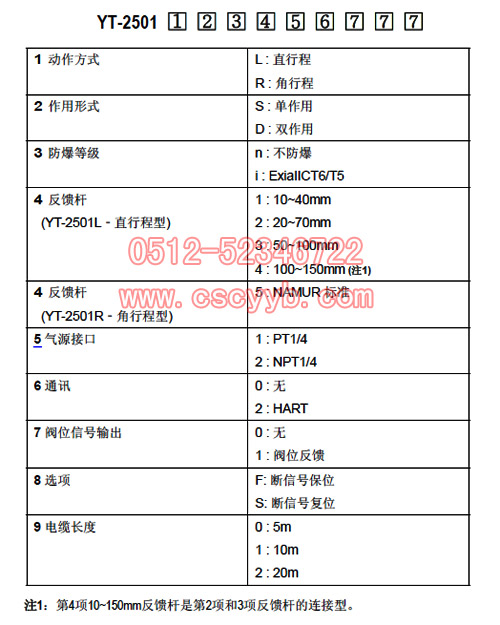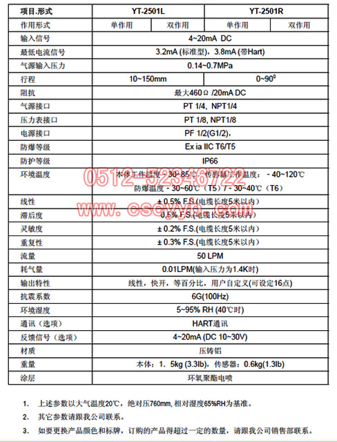 | YT-2501智能閥門定位器 YT-2501型智能閥門定位器是從控制器或控制系統接受4~20mA的電流信號,通過內置的高性能微處理器的處理可精確控制閥門開度,并且可進行自動設定,PID最佳控制,閥位信號反饋,HART通訊等強有力功能的新一代主力產品。  主要特征與功能 YT-2501型智能閥門定位器使用便利,現場應用更加穩定,其主要特征與功能如下: 1.傳感器和本體分離,可在高溫場合和震動大的場合使用. 2.當選擇短信號鎖位型時,斷開電流輸入信號或輸入氣源信號低于0.14MPa時,可以自動鎖住通往執行機構的氣路,保持當前閥門開度。 3.產品外部裝有液晶屏(LCD),因此可以在現場直接確認定位器的狀態。 4.抗震性能強,可適用于絕大部分現場。 5.簡單操作按鈕即可進行自動設定。 6.結構精小,在小型的執行機構也很容易安裝。 7.待機狀態下耗氣量接近零,對于大型工廠可節約能源,經濟性好。 8.可適用于低電壓(8.5V),因此對于控制系統幾乎沒有限制。 9.外部裝有可調節型節流孔,因此對于在小型執行機構產生的振蕩現象,可以一邊觀看一邊把節流孔調整到最佳狀態。 10.通過HART通訊,可以獲得閥門和定位器的各種情報。(HART通訊功能是選項) 10.可添加閥位輸出模塊,來確認閥門的開度。(閥位反饋功能是選項) 11.可任意設定線性,快開,等百分比等流量特性。 12.用戶可任意設定16個點來實現特殊的流量特性。 13.強制緊密關閉的起始點信號百分比可任意設定。 14.在現場不用其它設備,通過簡單操作按鈕即可調整PID值。 15.可進行4~12mA,12~20mA的分程控制。 16.通過手動調整設定定零位和量程。 17.通過手動運行功能,可以任意調節閥門開度,方便確認閥門的正常與否。 18.具有IP66優秀的防護等級。 19.選用耐腐蝕性能強的環氧聚酯進行電噴處理,因此可在具有腐蝕性的大氣環境中長時間使用。 20.內部結構非常簡單,進行了模塊化,減小了故障的幾率,維護方便。 參數表