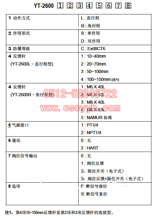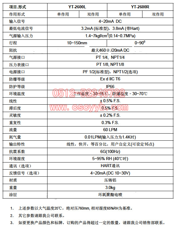 | YT-2600智能閥門定位器 韓國(guó)原裝進(jìn)口YT-2600型智能閥門定位器,是從控制器或控制系統(tǒng)接受4~20mA的電流信號(hào),通過(guò)內(nèi)置的高性能微處理器可精確控制閥門開(kāi)度,并且可進(jìn)行自動(dòng)設(shè)定,PID最佳控制,閥位信號(hào)反饋,HART通訊等強(qiáng)有力功能的新一代主力產(chǎn)品。  主要特征與功能 作為閥門定位器專業(yè)生產(chǎn)廠家,我公司應(yīng)用多年積累的生產(chǎn)經(jīng)驗(yàn)和開(kāi)發(fā)技術(shù),開(kāi)發(fā)生產(chǎn)的YT-2600型智能閥門定位器,不僅考慮了用戶的便利性,也考慮了現(xiàn)場(chǎng)應(yīng)用的穩(wěn)定性,其主要特征與功能如下: 1.當(dāng)斷開(kāi)電流輸入信號(hào)或輸入氣源信號(hào)(低于1.4kgf/cm2)時(shí),可以自動(dòng)鎖住通往執(zhí)行機(jī)構(gòu)的氣路,保持當(dāng)前閥門開(kāi)度。 2.產(chǎn)品外部裝有液晶屏(LCD)和四個(gè)按鈕,因此在現(xiàn)場(chǎng)不用打開(kāi)外殼就可以進(jìn)行自動(dòng)設(shè)定等操作。 3.抗震性能強(qiáng),可適用于絕大部分現(xiàn)場(chǎng)。 4.氣源壓力的變化幾乎不影響產(chǎn)品的正常工作。 5.自動(dòng)設(shè)定方法非常簡(jiǎn)單,初學(xué)者也很容易進(jìn)行設(shè)定。 6.待機(jī)狀態(tài)下耗氣量接近零,對(duì)于大型工廠可節(jié)約運(yùn)行成本。 7.可適用于低電壓(8.5V),因此對(duì)于控制系統(tǒng)幾乎沒(méi)有限制。 8.外部裝有流量調(diào)節(jié)旋鈕,對(duì)于在小型執(zhí)行機(jī)構(gòu)產(chǎn)生的振蕩現(xiàn)象,可以一邊觀看一邊調(diào)節(jié)最佳的輸出流量。 9.通過(guò)HART通訊,可以獲得閥門和定位器的各種情報(bào)。(HART通訊功能是選項(xiàng)) 10.可添加閥位輸出模塊,確認(rèn)閥門的開(kāi)度。(閥位反饋功能是選項(xiàng)) 11.可任意設(shè)定線性,快開(kāi),等百分比等流量特性。 12.用戶可任意設(shè)定16個(gè)點(diǎn)來(lái)實(shí)現(xiàn)特殊的流量特性。 13.強(qiáng)制緊密關(guān)閉的起始點(diǎn)信號(hào)百分比可任意設(shè)定。 14.在現(xiàn)場(chǎng)不用其它外部設(shè)備,通過(guò)簡(jiǎn)單操作按鈕即可調(diào)整PID值。 15. 可進(jìn)行4~12mA,12~20mA的分程控制。 16.通過(guò)手動(dòng)調(diào)整設(shè)定定零位和量程。 17.通過(guò)手動(dòng)運(yùn)行功能,可以任意調(diào)節(jié)閥門開(kāi)度,方便確認(rèn)閥門的正常與否。 18.防爆等級(jí)為ExdIICT6, 并且具有IP66優(yōu)秀的防護(hù)等級(jí)。 19.選用耐腐蝕性能強(qiáng)的環(huán)氧聚酯進(jìn)行電噴處理,因此可在具有腐蝕性的大氣環(huán)境中長(zhǎng)時(shí)間使用。 20.內(nèi)部結(jié)構(gòu)非常簡(jiǎn)單,進(jìn)行了模塊化,減小了故障的幾率,維護(hù)方便。 參數(shù)表