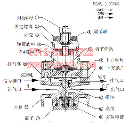 動作原理 信號壓力大于設定壓力,那么信號壓力向上推上方膜片⑻的下部,這時上方膜片⑻向上移動,同時通往下方膜片⑽的開起,信號壓力輸入到下壓下膜片⑽的上方氣室。下方膜片⑽受到壓力向下移動,推動推軸⑾,推軸⑾在推動底盤⒀,最終進氣口壓力通過氣鎖閥內部從出氣口排出,即進氣口和出氣口相通。 相反,如果信號壓力低于設定壓力,那么上方膜片⑻向下移動,通往下方膜片⑽的通路被切斷,鋼球⑺和上方膜片⑻之間產生空隙,壓住下方膜片⑽的上方氣室里的氣壓通過空隙排出。隨著下方膜片⑽上方氣室的壓力減小,與下方膜片⑽相連接的推軸⑾也會一起上升,最總底盤⒀切斷進氣口和出氣口的通路。  |