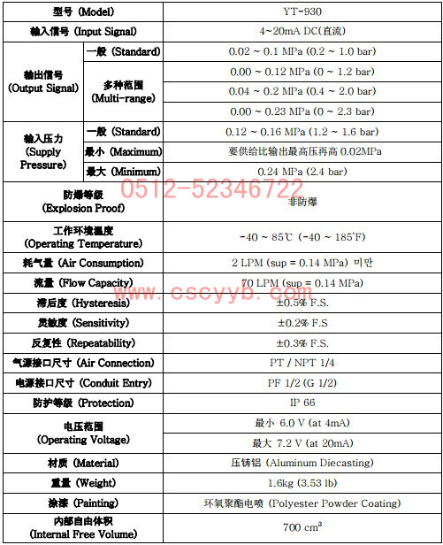 特征和功能 耗氣量小,對于大型工廠可節約能源,經濟性好。 具有IP66優秀的防護等級,使用范圍寬大。 適用于底電壓(8.5V),因此對于一般的控制系統可以互換使用。 選用耐腐蝕性能強的環氧聚酯電噴處理,可在具有腐蝕性的大氣環境中長時間。 使用零位(ZERO)或量程(SPAN)撥號盤,可以容易進行設定。 內部結構非常簡單,進行了模塊化,減小了故障的幾率,維護簡便。 氣源壓力的突然變化及嚴重振動的環境下,可正常動作。 安裝空氣過濾減壓閥 (YT-200)不需要單獨進行氣管連接,更方便。 技術參數