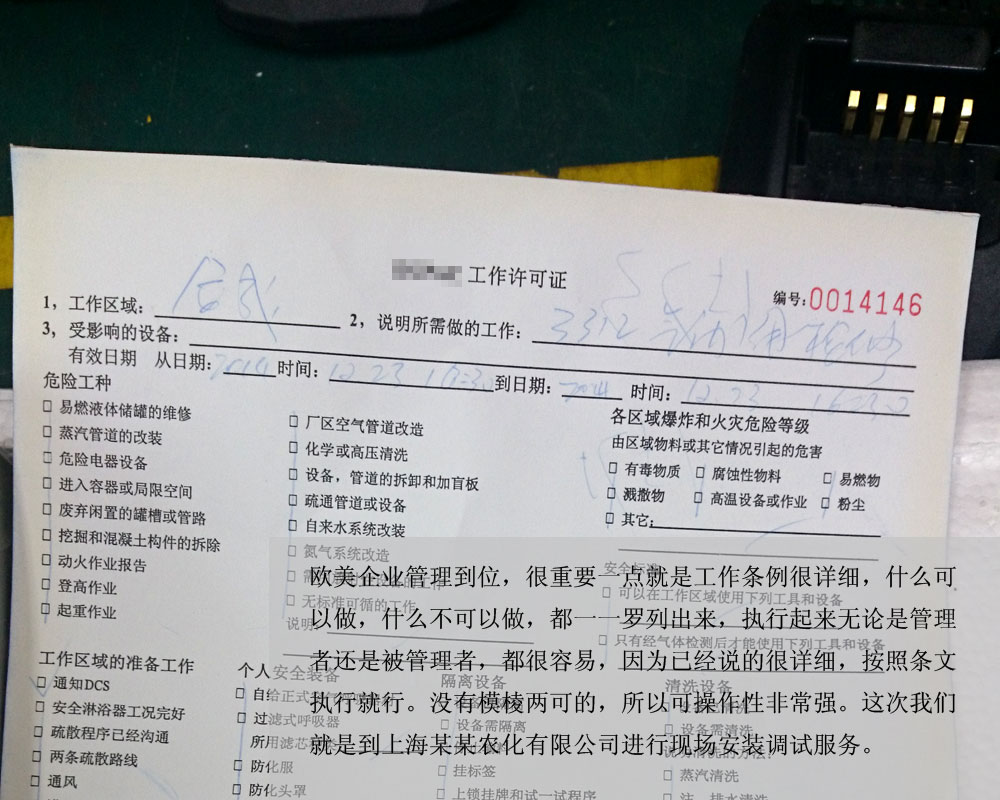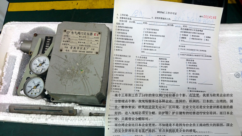 來(lái)個(gè)工單和工作了14年的常儀閥門(mén)定位器合個(gè)影。在這里,我要為歐美企業(yè)的安全管理點(diǎn)個(gè)贊。我現(xiàn)場(chǎng)服務(wù)過(guò)各種企業(yè),美國(guó)的,歐洲的,日本的,臺(tái)灣的,國(guó)企。整體來(lái)說(shuō),歐美的企業(yè)無(wú)論從廠區(qū)環(huán)境,企業(yè)文化還是安全意識(shí)都是做的最好的,進(jìn)入現(xiàn)場(chǎng)必須安全帽,防護(hù)鞋,護(hù)目鏡有的還要進(jìn)行安全培訓(xùn)。而日本企業(yè),只需帶安全帽即可。而臺(tái)灣企業(yè)比日本企業(yè)更差,不知道是不是因?yàn)榕_(tái)企員工流動(dòng)性大的原因。國(guó)企的安全管理也是非常嚴(yán)格的,有點(diǎn)參照歐美企業(yè)的感覺(jué)。