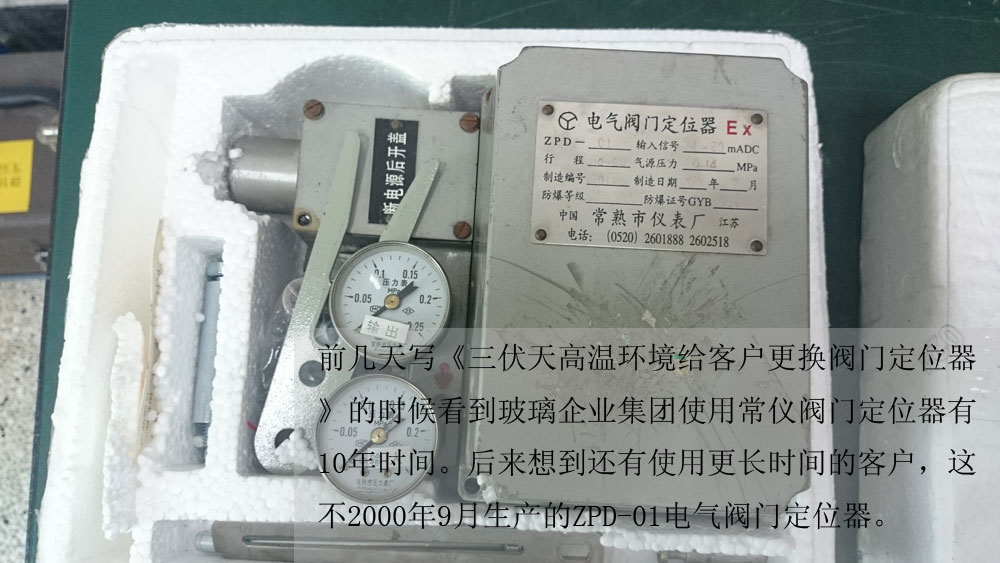 前幾天寫(xiě)《三伏天高溫環(huán)境給客戶更換閥門(mén)定位器》的時(shí)候看到玻璃企業(yè)集團(tuán)使用常陽(yáng)閥門(mén)定位器有10年時(shí)間。后來(lái)想到還有使用更長(zhǎng)時(shí)間的客戶,這不2000年9月生產(chǎn)的ZPD-01電氣閥門(mén)定位器。