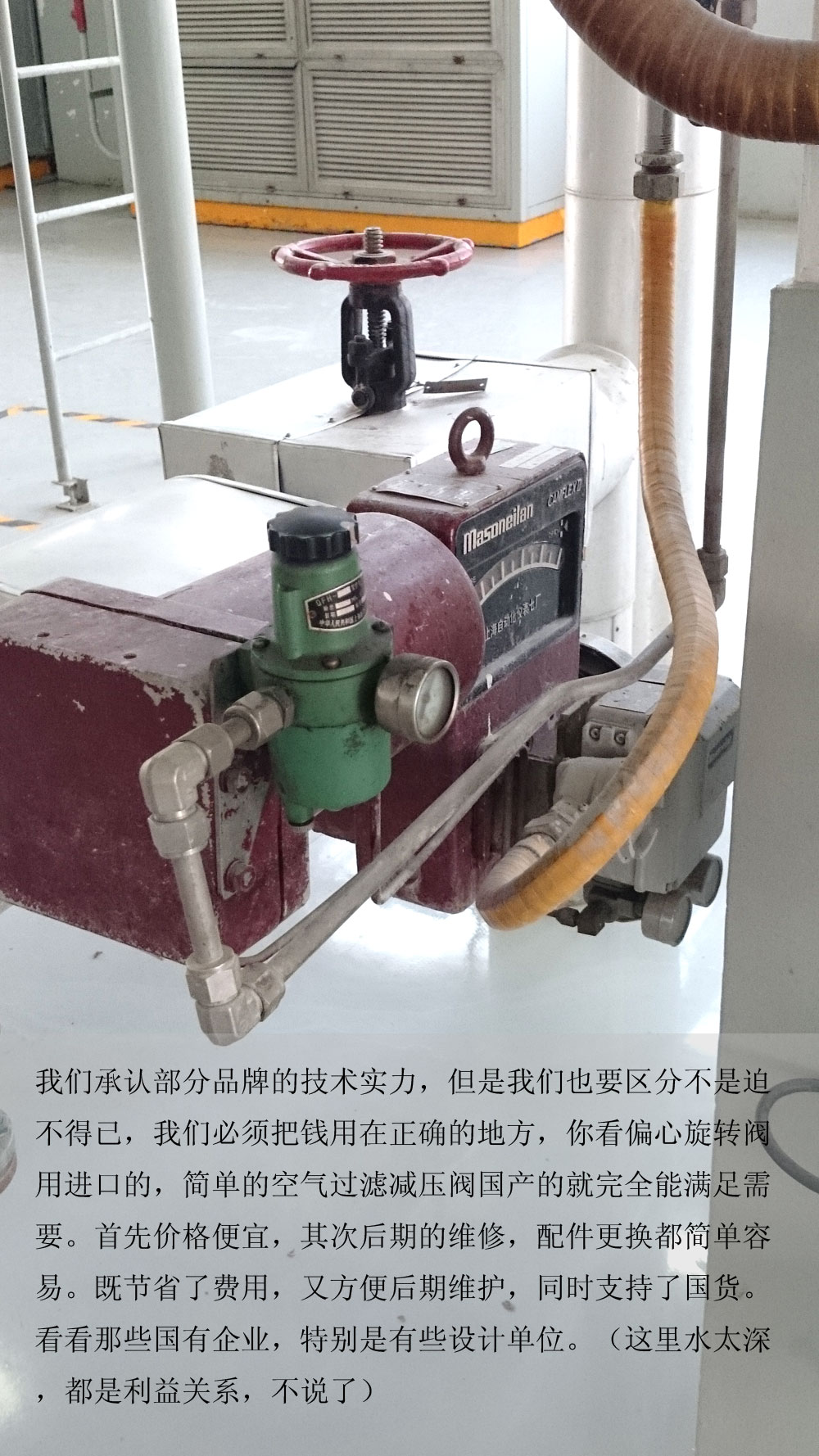我們承認(rèn)部分品牌的技術(shù)實(shí)力,但是我們也要區(qū)分不是迫不得已,我們必須把錢(qián)用在正確的地方,你看偏心旋轉(zhuǎn)閥用進(jìn)口的,簡(jiǎn)單的空氣過(guò)濾減壓閥國(guó)產(chǎn)的就完全能滿足需要。首先價(jià)格便宜,其次后期的維修,配件更換都簡(jiǎn)單容易。既節(jié)省了費(fèi)用,又方便后期維護(hù),同時(shí)支持了國(guó)貨。看看那些國(guó)有企業(yè),特別是有些設(shè)計(jì)單位。(這里水太深,都是利益關(guān)系,不說(shuō)了)