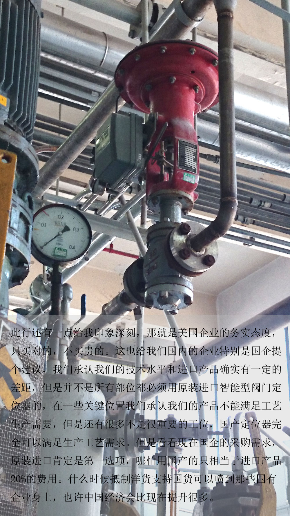 此行還有一點(diǎn)給我印象深刻,那就是美國(guó)企業(yè)的務(wù)實(shí)態(tài)度,只買(mǎi)對(duì)的,不買(mǎi)貴的。這也給我們國(guó)內(nèi)的企業(yè)特別是國(guó)企提個(gè)建議,我們承認(rèn)我們的技術(shù)水平和進(jìn)口產(chǎn)品確實(shí)有一定的差距,但是并不是所有部位都必須用原裝進(jìn)口智能型閥門(mén)定位器的,在一些關(guān)鍵位置我們承認(rèn)我們的產(chǎn)品不能滿足工藝生產(chǎn)需要,但是還有很多不是很重要的工位,國(guó)產(chǎn)定位器完全可以滿足生產(chǎn)工藝需求。但是看看現(xiàn)在國(guó)企的采購(gòu)需求,原裝進(jìn)口肯定是第一選項(xiàng),哪怕用國(guó)產(chǎn)的只相當(dāng)于進(jìn)口產(chǎn)品20%的費(fèi)用。什么時(shí)候抵制洋貨支持國(guó)貨可以噴到那些國(guó)有企業(yè)身上,也許中國(guó)經(jīng)濟(jì)會(huì)比現(xiàn)在提升很多。