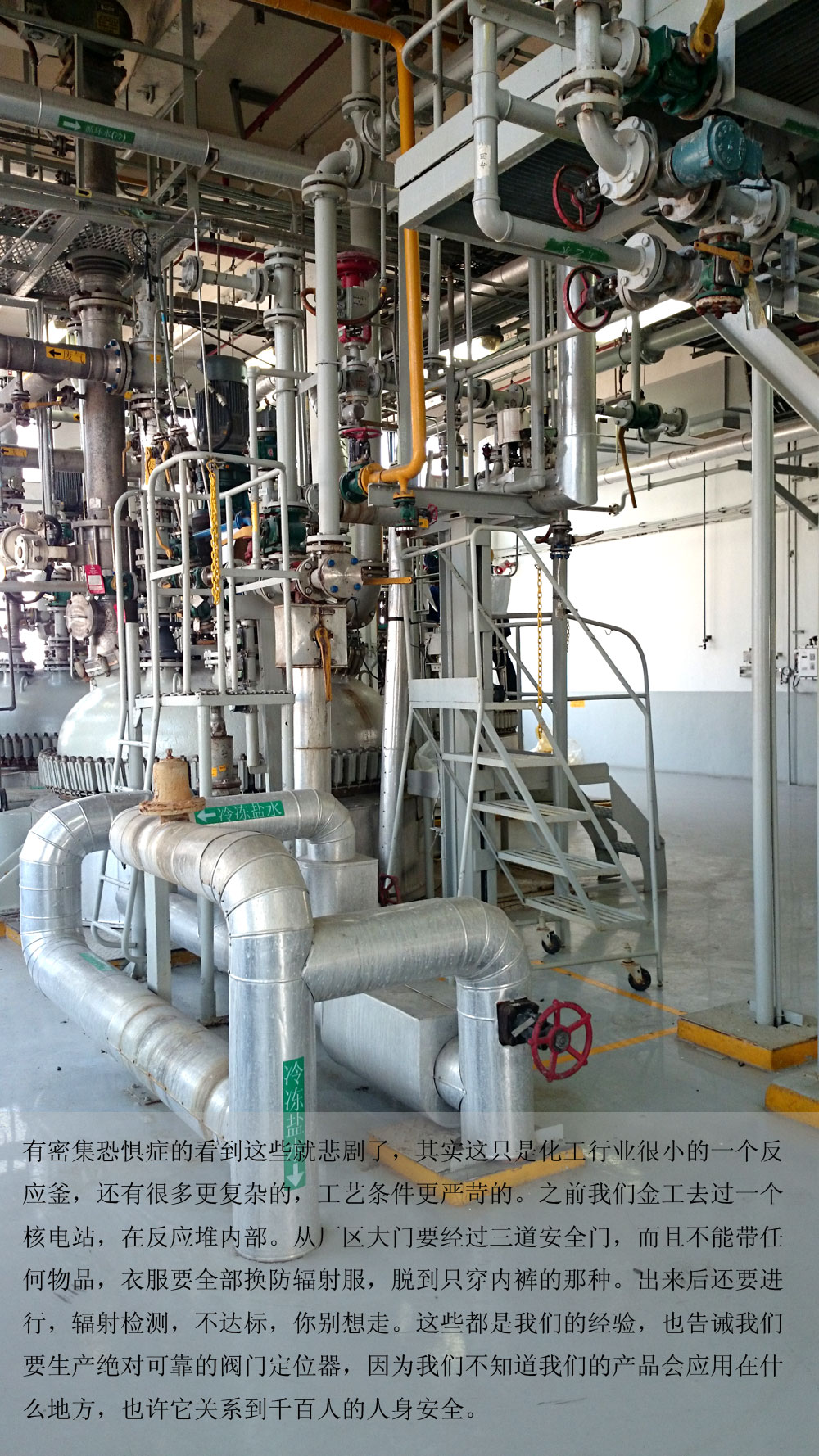 有密集恐懼癥的看到這些就悲劇了,其實(shí)這只是化工行業(yè)很小的一個(gè)反應(yīng)釜,還有很多更復(fù)雜的,工藝條件更嚴(yán)苛的。之前我們金工去過(guò)一個(gè)核電站,在反應(yīng)堆內(nèi)部。從廠區(qū)大門(mén)要經(jīng)過(guò)三道安全門(mén),而且不能帶任何物品,衣服要全部換防輻射服,脫到只穿內(nèi)褲的那種。出來(lái)后還要進(jìn)行,輻射檢測(cè),不達(dá)標(biāo),你別想走。這些都是我們的經(jīng)驗(yàn),也告誡我們要生產(chǎn)絕對(duì)可靠的閥門(mén)定位器,因?yàn)槲覀儾恢牢覀兊漠a(chǎn)品會(huì)應(yīng)用在什么地方,也許它關(guān)系到千百人的人身安全。