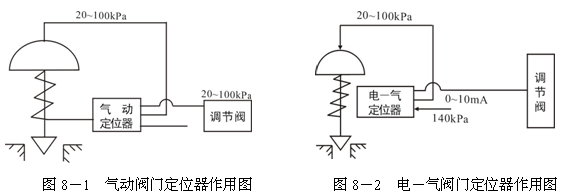 閥門定位器是調(diào)節(jié)閥的主要附件,它與調(diào)節(jié)閥配套使用,接受調(diào)節(jié)器的輸出信號,然后以它的輸出信號去控制調(diào)節(jié)閥,當(dāng)調(diào)節(jié)閥動作后,閥桿的位移又通過機(jī)械裝置反饋到閥門定位器,因此,這種定位器和調(diào)節(jié)閥組成一個閉環(huán)回路,如圖8-1和圖8-2所示。