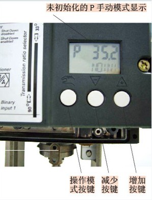 SIPART PS2智能閥門定位器在未初始化時的顯示如圖2,這是P-manual mode(P手動模式)顯示層面,右下的NOINI閃動說明還未做初始化。此時顯示當(dāng)前電位器的百分比數(shù)值,用于檢查電位器行程適應(yīng)情況和調(diào)整反饋桿/電位器的中間位置。按減少鍵或增加鍵可使閥門定位器輸出變化,讓氣動執(zhí)行機(jī)構(gòu)動作,觀察電位器測量范圍是否在行程范圍內(nèi),再使執(zhí)行機(jī)構(gòu)位于50%行程/閥位時,調(diào)整外部的反饋桿連接件或殼內(nèi)的調(diào)整輪使顯示值為P 50左右,完成初始檢查和調(diào)整。