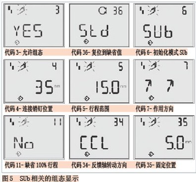 必須輸入相應(yīng)的關(guān)鍵參數(shù):代碼4的連接銷釘位置、代碼5的額定工作行程、代碼7的作用方向、代碼34的反饋軸轉(zhuǎn)動方向。此外,代碼11缺省100%行程組態(tài)為NO。