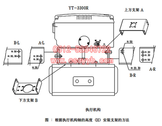 如:當執(zhí)行機構軸的高度(H)是30mm時,參考下圖,上方支架A上的左邊A‐L標有H:30和下方支架B上的左邊B‐L標有H:20,30的孔對準并連接,右邊A‐R的H:30和B‐R的H:20,30對準,并用螺栓固定。