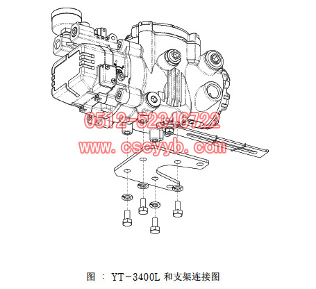 2.利用螺栓組裝支架和YT-3400L。組裝時按如下圖所示,用螺栓把YT-3400L固定到支架上。螺栓的規格是M8 X 1.25P,其它標準螺栓也可選用。