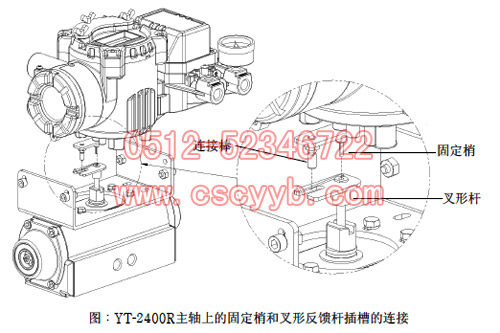 6.把YT-2400R安裝在支架上。YT-2400R放置在支架上方時,YT-2400R的主軸下面的固定梢對準叉形桿上方的中心孔內,同時把主軸反饋桿上的連接棒插入到叉形桿的插槽。這是為了讓YT-2400R的主軸和氣缸軸的中心一致,如果中心沒有對準,那么YT-2400R的主軸上產生負荷力,影響產品的內構成,因此請正確對準中心。