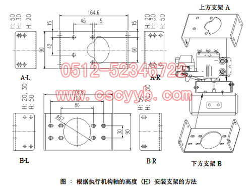 如:當執行機構軸的高度(H)是30mm時,參考下圖,上方支架A上的左邊A‐L標有H:30和下方支架B上的左邊B‐L標有H:20,30的孔對準并連接,右邊A‐R的H:30和B‐R的H:20,30對準并用螺栓固定。