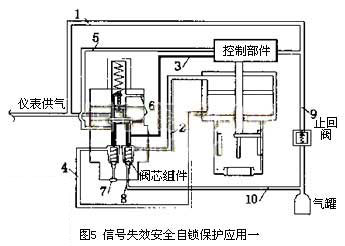 2.1.1信號失效氣動控制閥全開或全關安全保護在圖5中,1號管路為儀表供氣管路,2號管路為給氣缸頂部壓力的管路,3號管路為給氣缸頂部控制壓力的管路,4號管路為給氣缸底部壓力的管路,5號管路為給氣缸底部控制壓力的管路,6號為鎖定部件上下膜片來回運動的排氣口,7號為儲氣罐提供給氣缸底部的供氣口,8號為儲氣罐提供給氣缸頂部的供氣口,9號管路為儲氣罐提供給控制部件供氣壓力的管路,10號管路為儲氣罐提供給氣缸頂部或底部供氣壓力的管路。