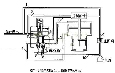 在以上的信號失效控制閥安全保護示意圖中,止回閥在信號失效時,會保證儲氣罐的儲氣壓力輸送到氣缸的頂部、底部或頂部和底部。當供氣壓力恢復到正常時,止回閥恢復到原來的位置,以保證儲氣罐充滿所需要的氣壓,以備下次信號失效時繼續發揮它的作用。