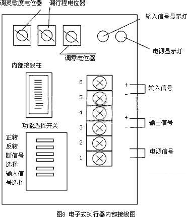 2.2信號失效電動控制閥的安全保護電動控制閥的關鍵部件在于其內部樹脂澆鑄的控制器,其接受來自調節器的毫安或電壓信號和來自開度檢測器的開度信號,將兩信號相比較并放大,向消除其差值的方向驅動和控制電機,其結果是使得來自調節器信號和開度信號之間的偏差被減小,當偏差消除時控制部分令電機停止在該位置上,達到調節和控制的目的。當信號失效時,輸出軸在相應的時間內仍處于運轉狀態,如果沒有相應的控制措施,會停留在某一個位置,而失去對電動控制閥的安全保護。根據工藝過程的需要,在電動控制閥的設計選型和安裝過程中,就應該注意到信號失效時電動控制閥的安全保護。在圖8電動控制閥電子式執行器內部接線圖中,信號失效時根據工藝過程的需要使閥門開度仍然處于信號失效前的位置時,將圖中的3和4斷開,接通5,就可以使輸出軸停止在原位置,使閥門開度保持不變。