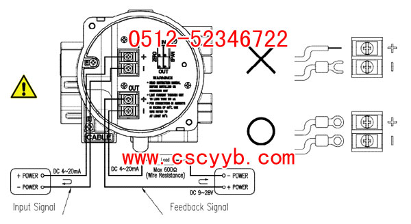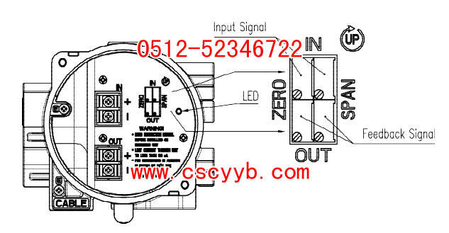終端概述 輸入電流信號及反饋信號端鏈接 1、打開基本蓋板。 2、請考慮操作條件使用適當的結合。插入電纜用適當的防爆型包裝聯合。 3、找到在左邊輸入信號的電纜入口側和產物的底側. 將電纜插入導管入口,并固定好(+)和(-)對平板終端。確保使用1.5 Nm (15 kgf-cm)的力矩擰緊螺栓。請檢查端子的極性。 4、有兩個端子用于接地。 5、接地電阻必須小于100歐姆。 6、在使用產品前要完全關閉罩基。  調整 我們的產品是由YTC設施派遣之前,對供給壓力或對輸入信號的供給壓力的輸入信號將被設置正確。如果例外的設置要求,請參閱以下 輸入信號的零點和量程調整 (基于4~20mA/0.02~0.1MPa) 1. 接線已完成后,請提供4mA作為輸入信號. 請檢查輸出壓力,通過使用小( - )螺絲刀調整零點調整螺栓。在一般情況下,零應在0.02MPa. 2. 供應20mA輸入信號。請檢查輸出壓力和調節范圍調節螺栓所需的最終輸出。在一般情況下,跨度應該在0.1MPa設置20mA. 3. 再次供應4mA電流。請檢查輸出壓力并重復步驟1和2,直到需要點已完全設置. 4. 完全關閉罩基. 反饋信號的零點和量程調整 (基于4~20mA/0.02~0.1MPa) 1. 反饋信號需要DC 9 〜28V 。供應4mA電流。請檢查輸出壓力為零點和正確地接收反饋信號。如果沒有,用小的( - )螺絲刀調整零點調整螺栓,直到接收反饋信號被設置為4mA. 2. 供應20mA電流信號。請檢查輸出壓力為終點,正確地接收反饋信號。如果沒有,用小的( - )螺絲刀調整跨度調整螺栓,直到接收反饋信號被設置為20mA. 3. 再次供應4mA電流。請檢查輸出壓力并重復步驟1和2,直到需要點已完全設置. 4. 完全關閉罩基.  |
